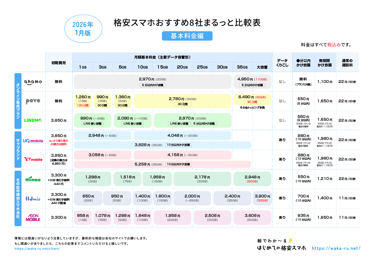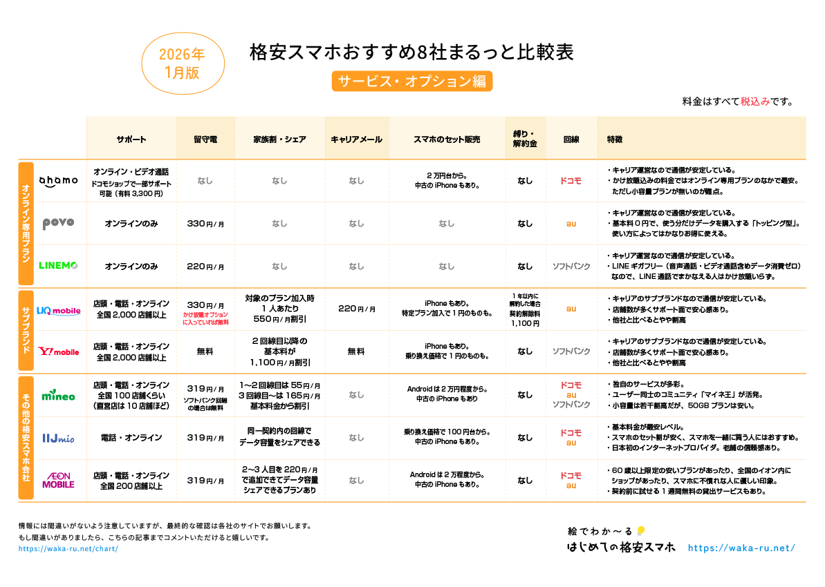 各社の料金やサービス・オプション内容をまるっとまとめた比較表。サイトの内容が間違っていないかの確認も兼ねて、毎月更新しています。ざざっと比較したいときに活用してください!