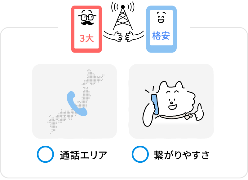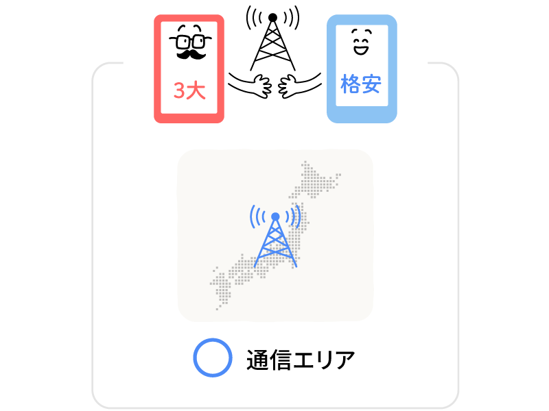 格安スマホは3大キャリアと同じ回線を使っているので、通話エリアや繋がりやすさはキャリアと同等です。