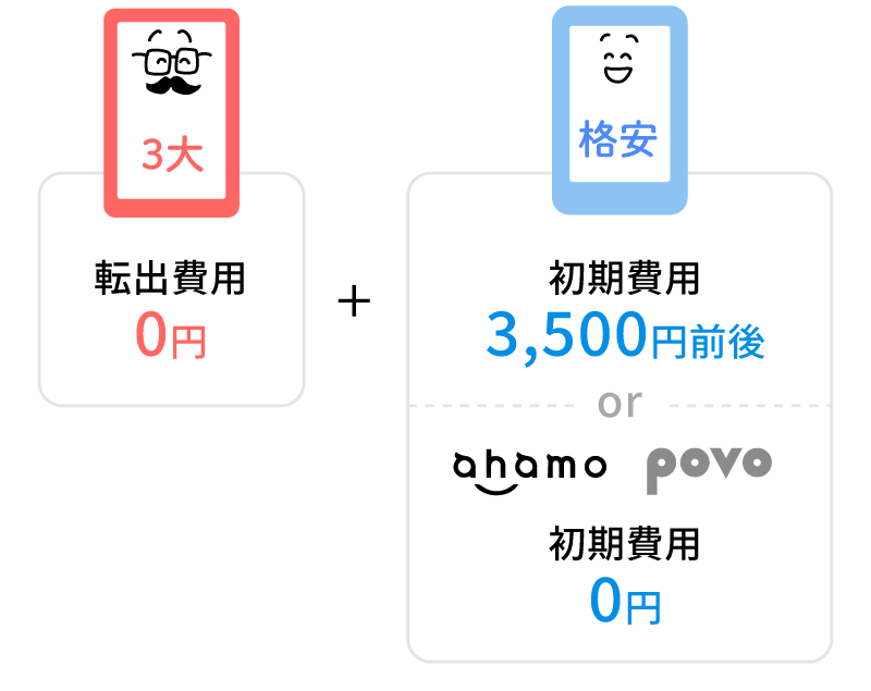 一方、乗換え先の格安スマホ会社では、初期費用として3,500円〜4,000円程度かかるのが一般的です。ただしahamoとpovoの2社は初期費用が無料です。