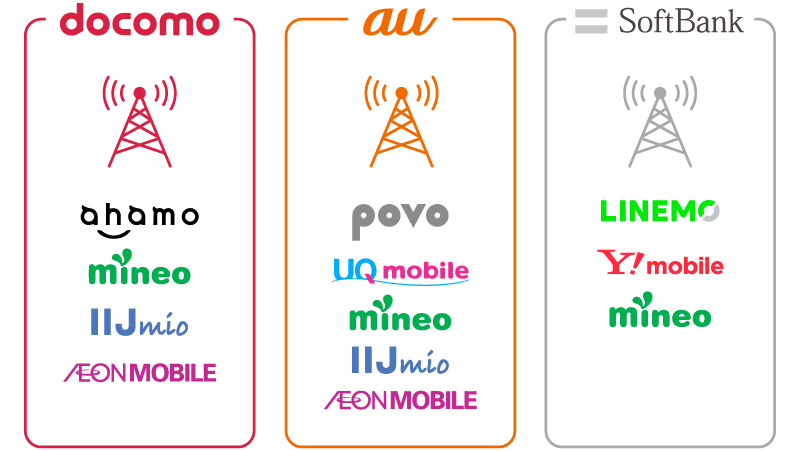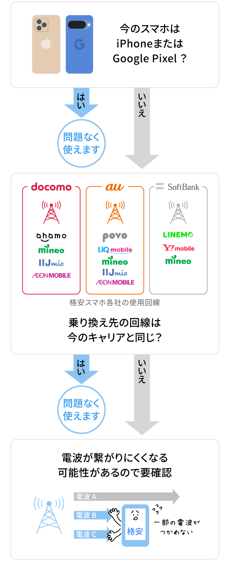 まず、iPhone か Google Pixel であれば、ほとんどの格安スマホ会社でそのまま使えます(どちらも多くの回線に対応しているため)。