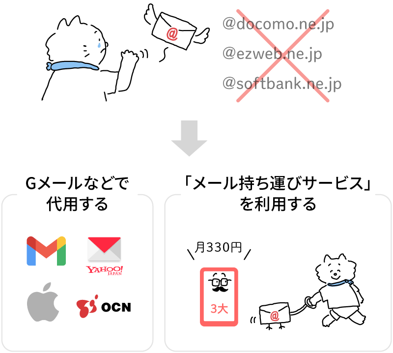 基本的に、これまで使っていたキャリアメールアドレス(〇〇@docomo.ne.jpなど)は使えなくなります。