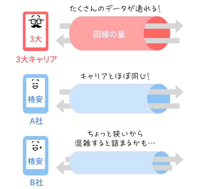 ただし、「通信速度」は会社によって少し違います。格安スマホは3大キャリアに回線を借りていますが、会社ごとに借りている回線の量が違うため、通信速度にも違いが出てきます。