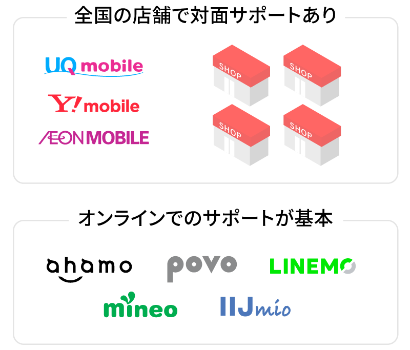 たとえば、UQモバイル・ワイモバイル・イオンモバイルの3社は、全国に店舗があり、設定や手続きのサポートを受けられます。