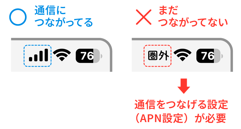 電波が「圏外」になっている場合は、通信をつなげる設定(「APN設定」)が必要になります。