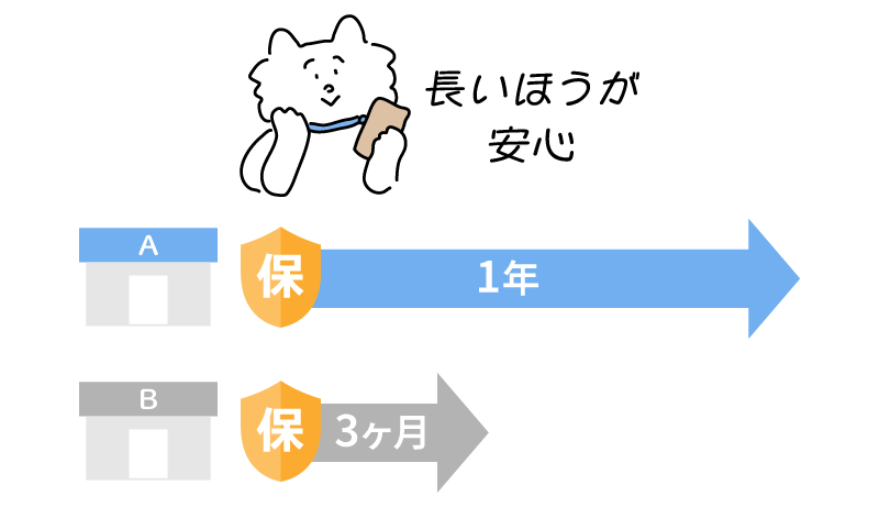 3ヶ月だったり1年だったり、保証期間はお店によって結構違いがあります。当然、長いほうがより安心して使えます。