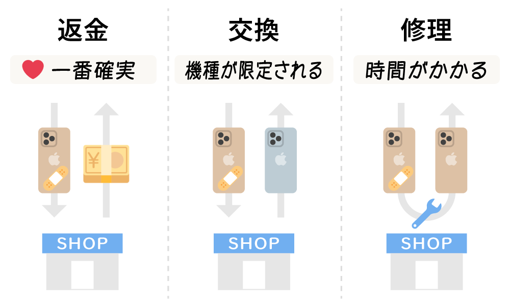 実際に保証を使うときにどういう対応になるかを見ておきます。主に「返金・交換・修理」の3つがあります。