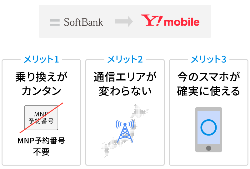 ソフトバンクからは乗り換えがカンタン。ワイモバイルはソフトバンクの回線を使っているので、通信エリアや対応スマホの心配もいりません。