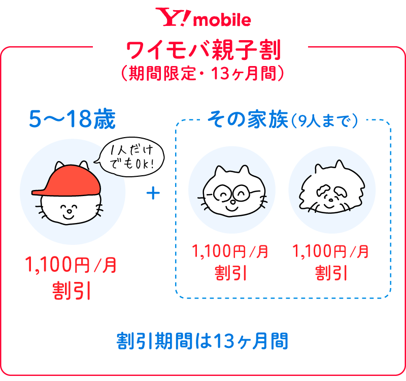 | 👪 家族割 | 家族割引:2回線目以降の基本料金1,100 円 / 月割引 親子割:子どもとその家族の料金が毎月1,100円割引(13ヶ月間) |